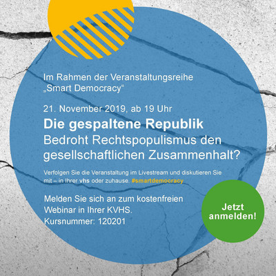 Unsere Gesellschaft driftet auseinander – dies ist zumindest das Gefühl vieler Menschen und auch in den Medien immer wieder zu hören. Vor allem bei den Themen Migration und Integration verhärten sich die gegensätzlichen Standpunkte: sachliche Auseinandersetzungen mit Andersdenkenden kommen kaum zustande, stattdessen mehren sich Angriffe auf unser demokratisches System, auf die öffentlich-rechtlichen Medien und auf die Vielfalt als Grundlage unseres Zusammenlebens. Die Erfolge populistischer Parteien können dabei als Ausdruck einer zunehmenden Sehnsucht nach einfachen Wahrheiten gesehen werden. Im Rahmen der Veranstaltung wird es um grundlegende Fragen gehen: Wie steht es aktuell um den Zusammenhalt in unserer Gesellschaft? Welche sozialen und kulturellen Hintergründe gibt es für den Erfolg von Rechtspopulisten? Wie sind die Ergebnisse der Wahlen im Wahljahr 2019 in diesem Zusammenhang zu bewerten? Wie können wir als Gesellschaft – aber auch als Einzelpersonen – zu mehr Zusammenhalt beitragen?